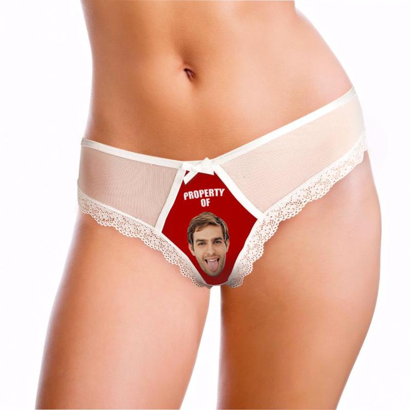 Kundenspezifischer Spitzen-Tanga Sexy weiß Spitzenunterwäsche Lustiges Geschenk mit dem Gesicht des Freundes - Eigentum von