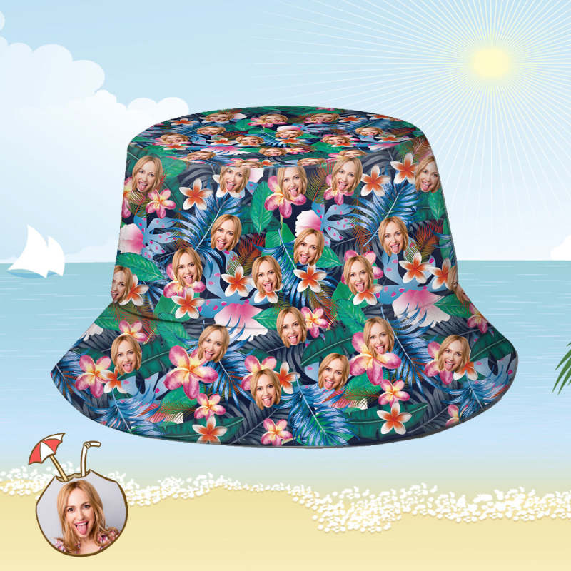 Benutzerdefinierte Eimer Hut Personalisiertes Gesicht als Allover-Print Tropischer Blumendruck Hawaiischer Fischerhut - Mode Blumen