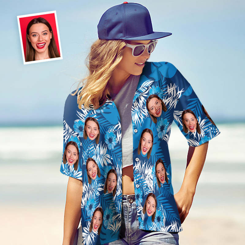 Benutzerdefiniertes Gesicht Hawaiihemd Frauen All Over Print Blaues Kurzarmhemd