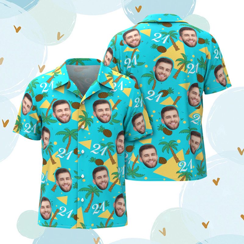 Benutzerdefinierte Mehrfarbige Gesicht Und Zahlen Hawaiihemd Kokosnussbaum Und Ananas Geschenk Für Männer