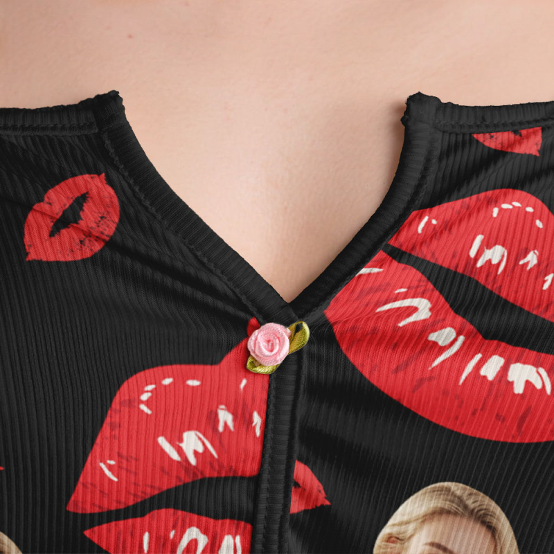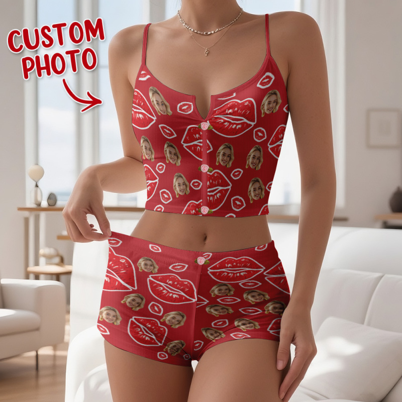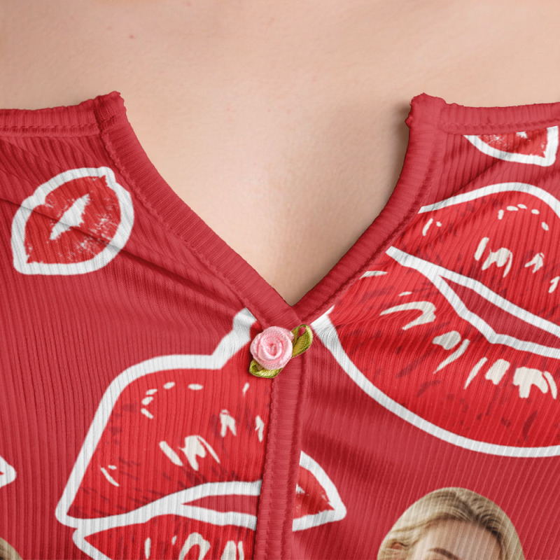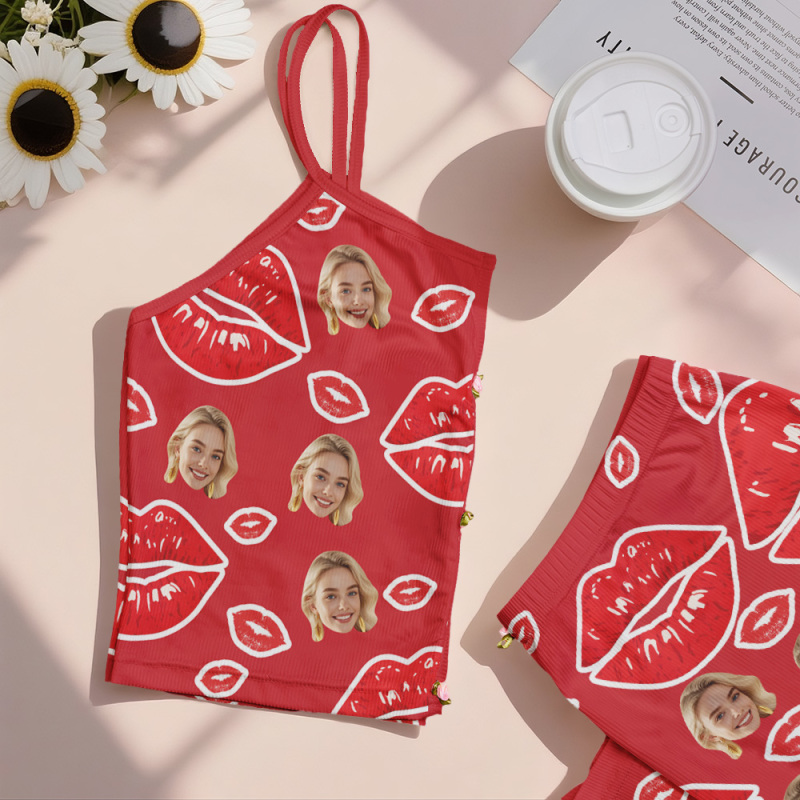 Valentinstags-geschenke, Individuelles Dessous-set Mit Gesichtsapplikationen, Gekerbtem Ausschnitt, Rote Lippen